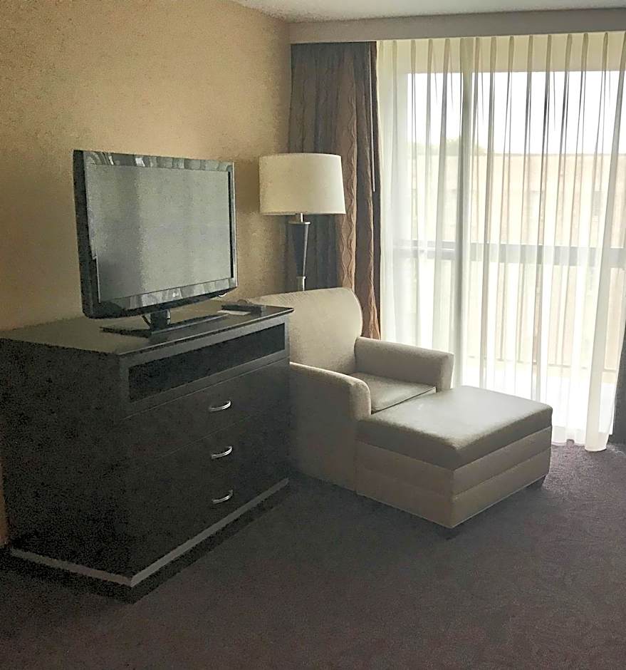Accessible room features a microwave, a small refrigerator and a 37-inch flat-screen cable TV.